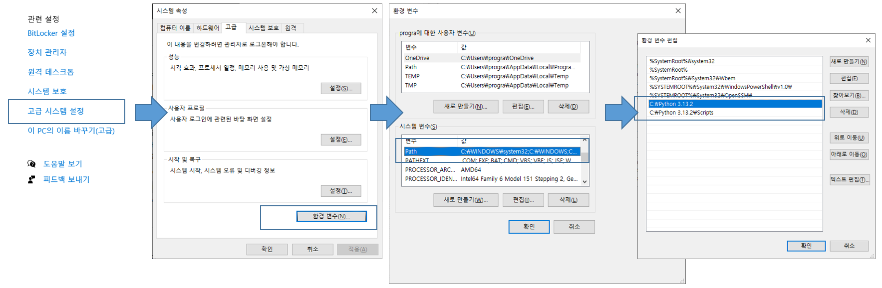 오류 해결방법은 위와 같은 경로로 들어가서, 고급 시스템 설정 > 환경변수 > 편집 > scripts 폴더 추가하여 저장하시면 완료되며, 그래도 안될 경우 윈도우를 재시작 하시면 완료 됩니다.